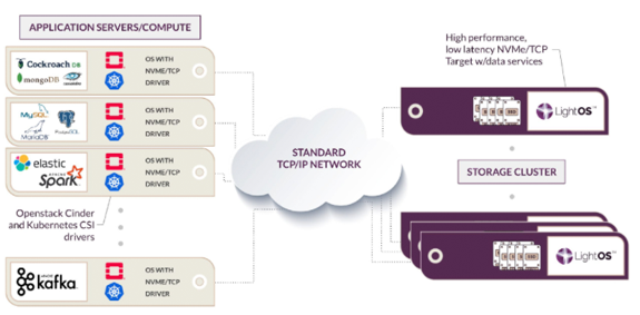 We pioneered NVMe/TCP so that you can extend NVMe across the entire data center using simple and efficient TCP/IP fabrics. You simply populate LightOS target servers with the drives of your choice and then any application server on the network can enjoy NVMe performance. |